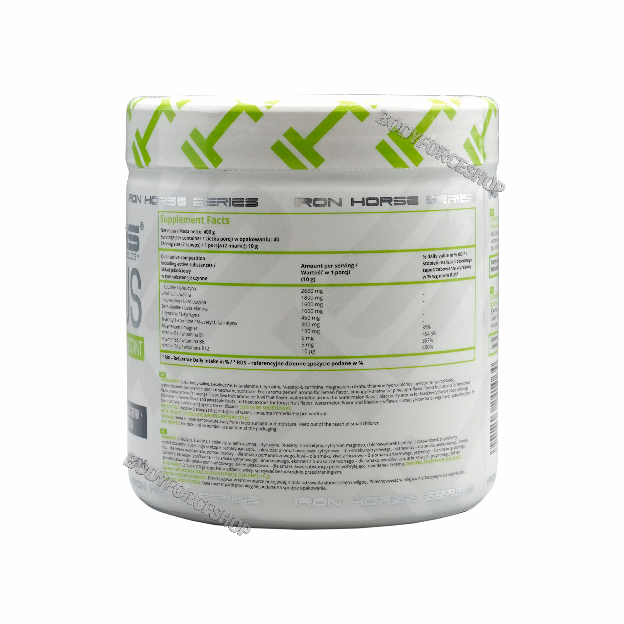- حاوی BCAA با نسبت ۲:۱:۱ (لوسین، ایزولوسین، والین) برای افزایش قدرت و استقامت عضلات.
