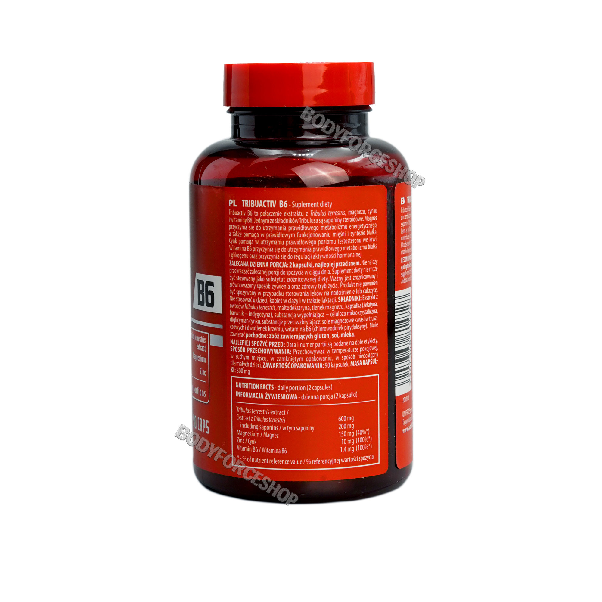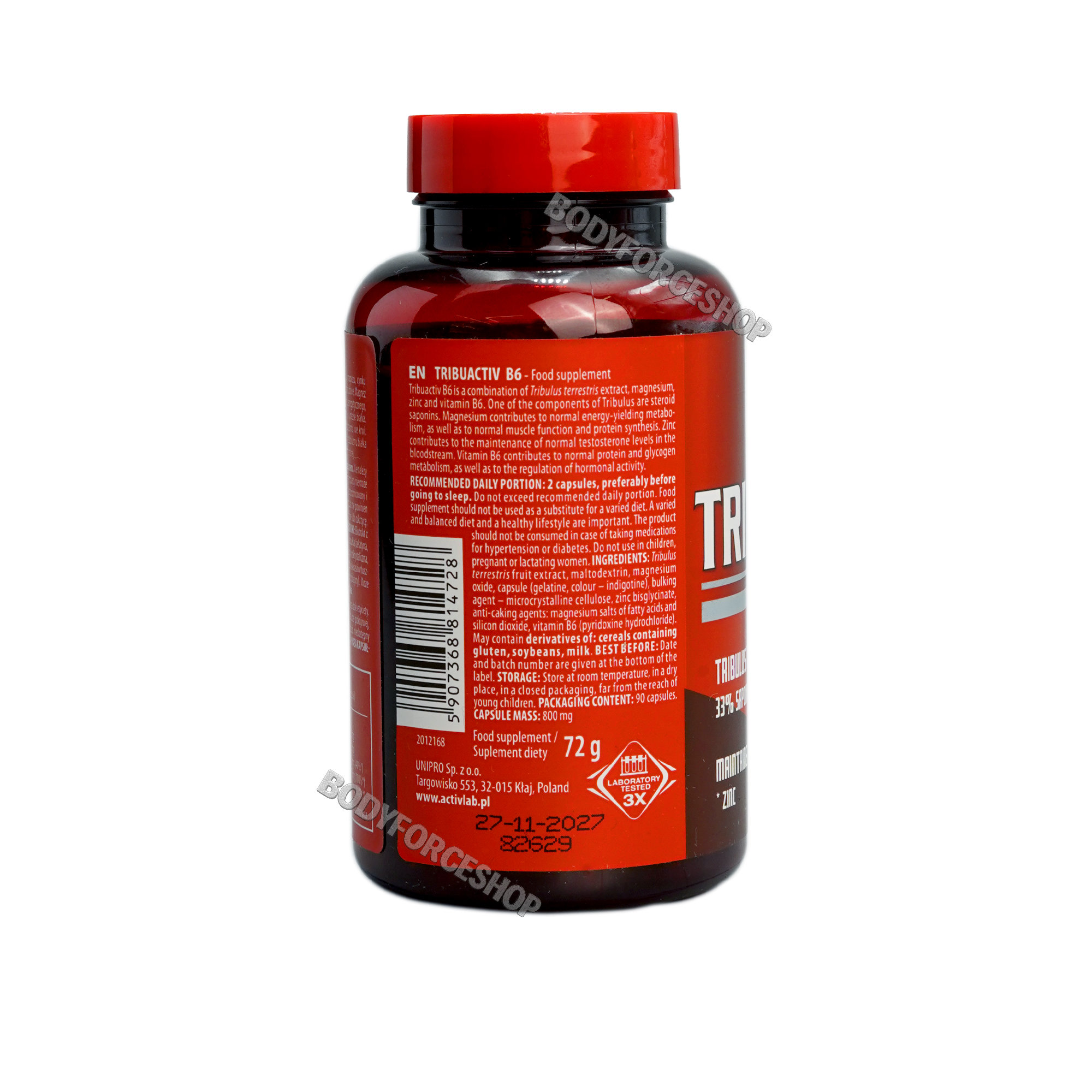 مکمل Activlab Tribuactiv B6 از کمپانی لهستانی Activlab Nutrition، یک تستبوستر گیاهی، علمی و چندمنظوره است که با ترکیب استاندارد شده خارخاسک (Tribulus Terrestris)، منیزیم، زینک و ویتامین B6 برای افزایش تستوسترون آزاد، بهبود عملکرد عضلانی و افزایش استقامت طراحی شده. هر دو کپسول حاوی 1000 میلیگرم عصاره Tribulus با غلظت 600mg ساپونین فعال بوده که مستقیماً روی غده هیپوفیز اثر گذاشته و تولید تستوسترون طبیعی را تحریک میکند. منیزیم و زینک بهعنوان مواد معدنی کلیدی در تولید تستوسترون، سنتز پروتئین و بهبود عملکرد عضلانی عمل میکنند.