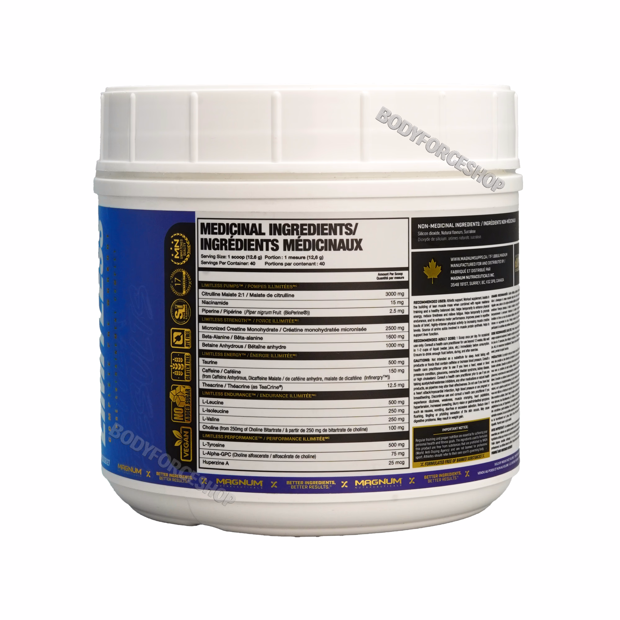 مکمل Magnum Limitless از کمپانی معتبر کانادایی Magnum Nutraceuticals، یک پری ورکاوت حرفهای و چندمنظوره است که با هدف افزایش انرژی، تمرکز ذهنی، پمپ عضلانی و قدرت انفجاری طراحی شده. این محصول با بیش از 21 گرم ترکیبات فعال در هر وعده، یکی از کاملترین فرمولهای قبل تمرین در دنیاست. ترکیبات کلیدی آن شامل 5g کراتین مونوهیدرات، 6g سیترولین مالات، 3.2g بتا آلانین، 2g بتائین، 500mg تیروزین، 150mg کافئین، 75mg آلفا GPC، و 25mcg هوپرزین A است که بهصورت همافزا باعث افزایش قدرت، استقامت، تمرکز و خونرسانی به عضلات میشوند. این مکمل با تکنولوژی NextGen Flavor™ در طعمهای جذاب مثل لیموناد صورتی، تمشک آبی و انبه هلو تولید شده و فاقد شکر، گلوتن، رنگ مصنوعی و مواد نگهدارنده است.