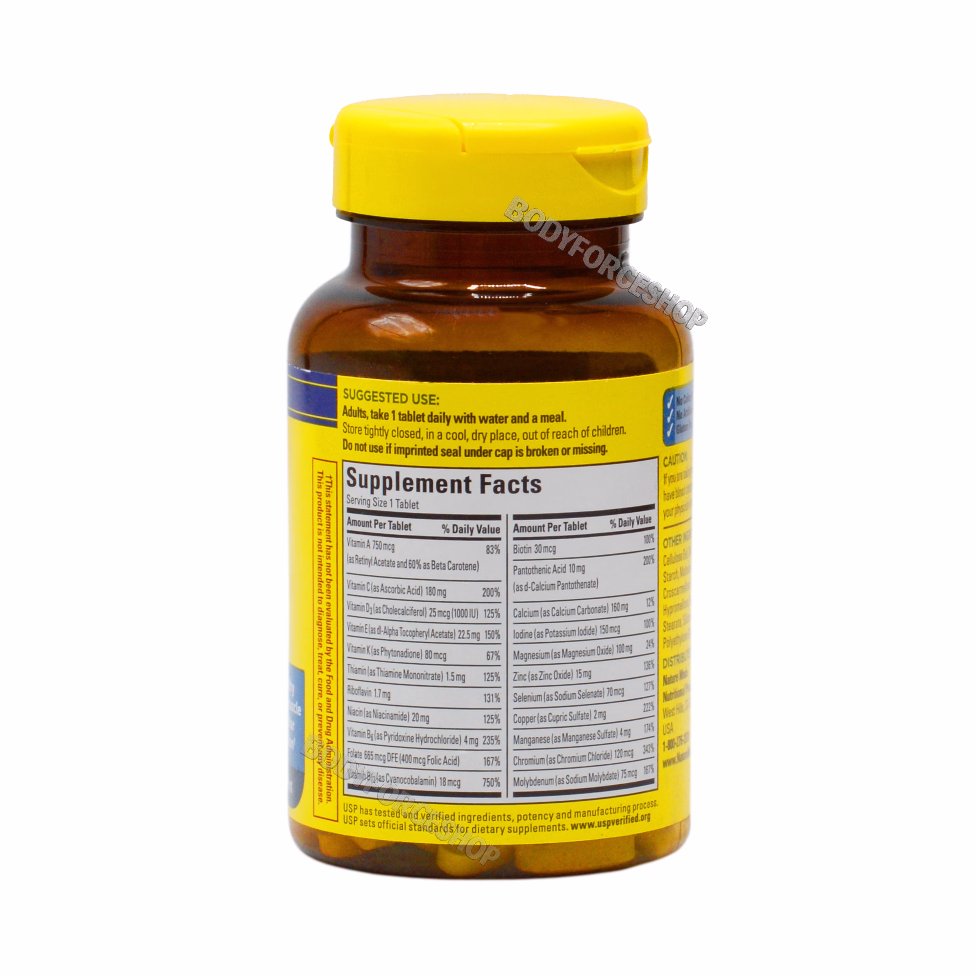 مولتی ویتامین مردانه نیچر مید از کمپانی معتبر آمریکایی Nature Made تولید شده؛ شرکتی با بیش از 50 سال سابقه در تولید مکملهای دارویی با استانداردهای علمی و داروسازی. مولتی ویتامین مردانه نیچر مید با ترکیب دقیق 22 ماده مغذی کلیدی شامل ویتامینهای A، C، D3، E، K، گروه B، فولیک اسید، بیوتین، زینک، سلنیوم، کروم، منیزیم، ید، کلسیم، مس، منگنز و مولیبدن طراحی شده تا از سلامت عمومی، سیستم ایمنی، عملکرد مغز، سلامت قلب، استخوانها و تولید انرژی سلولی حمایت کند. مولتی ویتامین مردانه نیچر مید فاقد گلوتن، رنگ مصنوعی، نگهدارندههای شیمیایی و آهن اضافه است، که برای بسیاری از آقایان ضروری نیست مگر در شرایط خاص پزشکی.