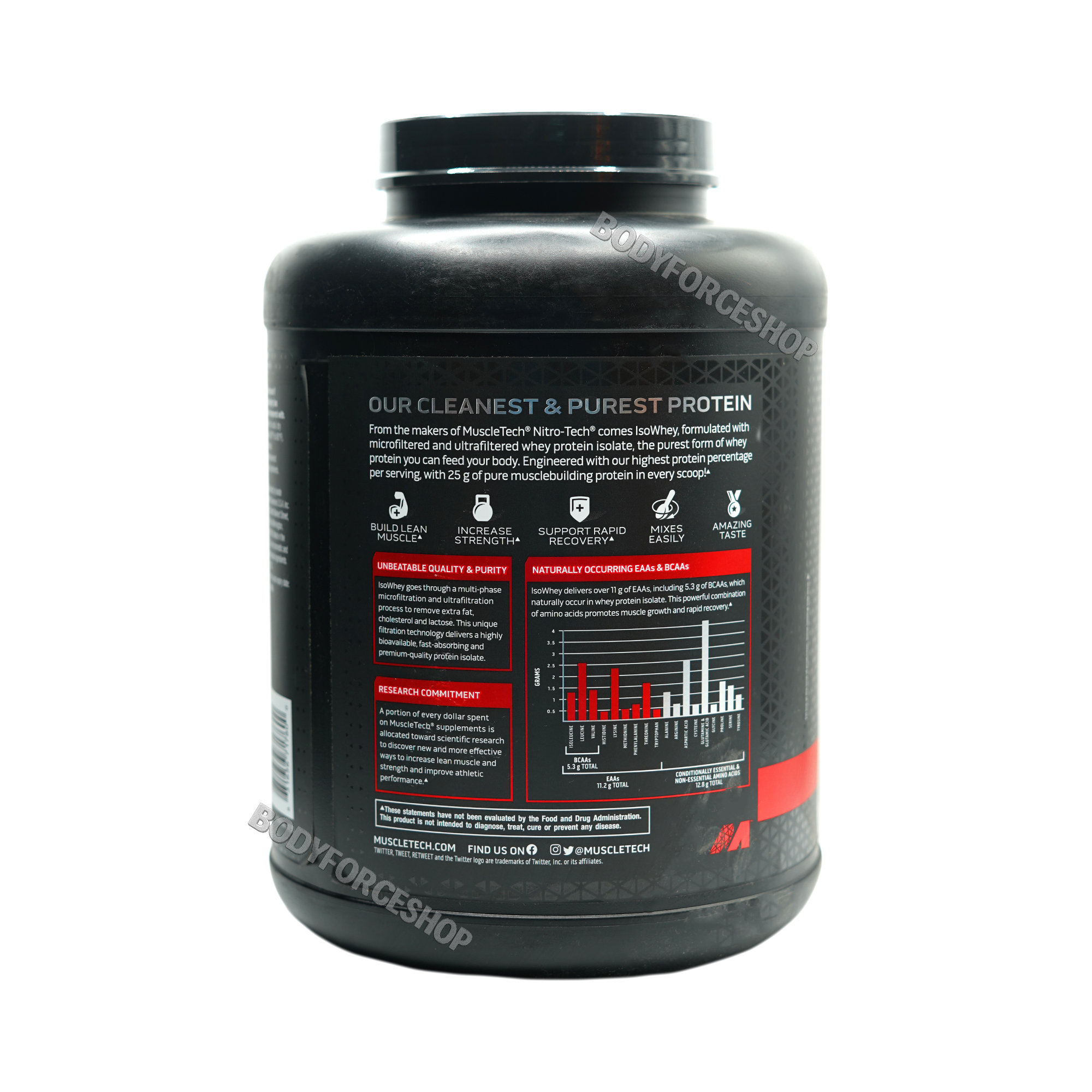 پروتئین وی ایزوله ماسل تک (MuscleTech IsoWhey) یکی از خالص‌ترین و سریع‌جذب‌ترین مکمل‌های پروتئینی دنیا است که با استفاده از تکنولوژی میکروفیلتراسیون و اولترافیلتراسیون تولید میشود. هر پیمانه از این محصول حاوی ۲۵ گرم پروتئین وی ایزوله و هیدرولیز شده است که بدون چربی، لاکتوز و قند اضافی ارائه می‌شود. این مکمل ماسل تک با ترکیب BCAA و EAA، به رشد عضلات خشک، ریکاوری سریع‌تر و تقویت عملکرد ورزشی کمک می‌کند. به دلیل جذب سریع، بلافاصله پس از تمرین قابل استفاده است و از تحلیل عضلانی جلوگیری می‌کند. طعم دلپذیر، هضم آسان و عدم ایجاد نفخ، آن را برای ورزشکاران حرفه‌ای و مبتدی ایده‌آل کرده.