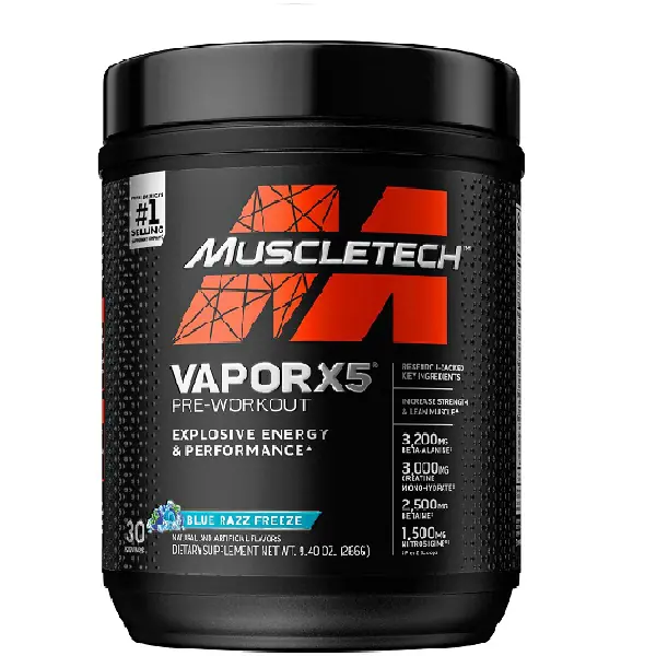 ویپور ایکس 5 از برند معتبر MuscleTech آمریکا یک مکمل پیشتمرین (پریورکاوت) پیشرفته و چندکاره است که با فرمولی علمی، برای بهبود عملکرد ورزشی، افزایش تمرکز ذهنی، انرژی انفجاری و پمپ عضلانی طراحی شده است. این مکمل با ترکیب مؤثر کافئین، بتاآلانین، کراتین، نیتراتها و ترکیبات محرک عصبی، بدن و ذهن شما را برای انجام تمرینات شدید و سنگین آماده میکند. Vapor X5 انتخابی حرفهای برای ورزشکارانی است که بهدنبال بیشینه کردن عملکرد و پیشرفت سریع هستند.