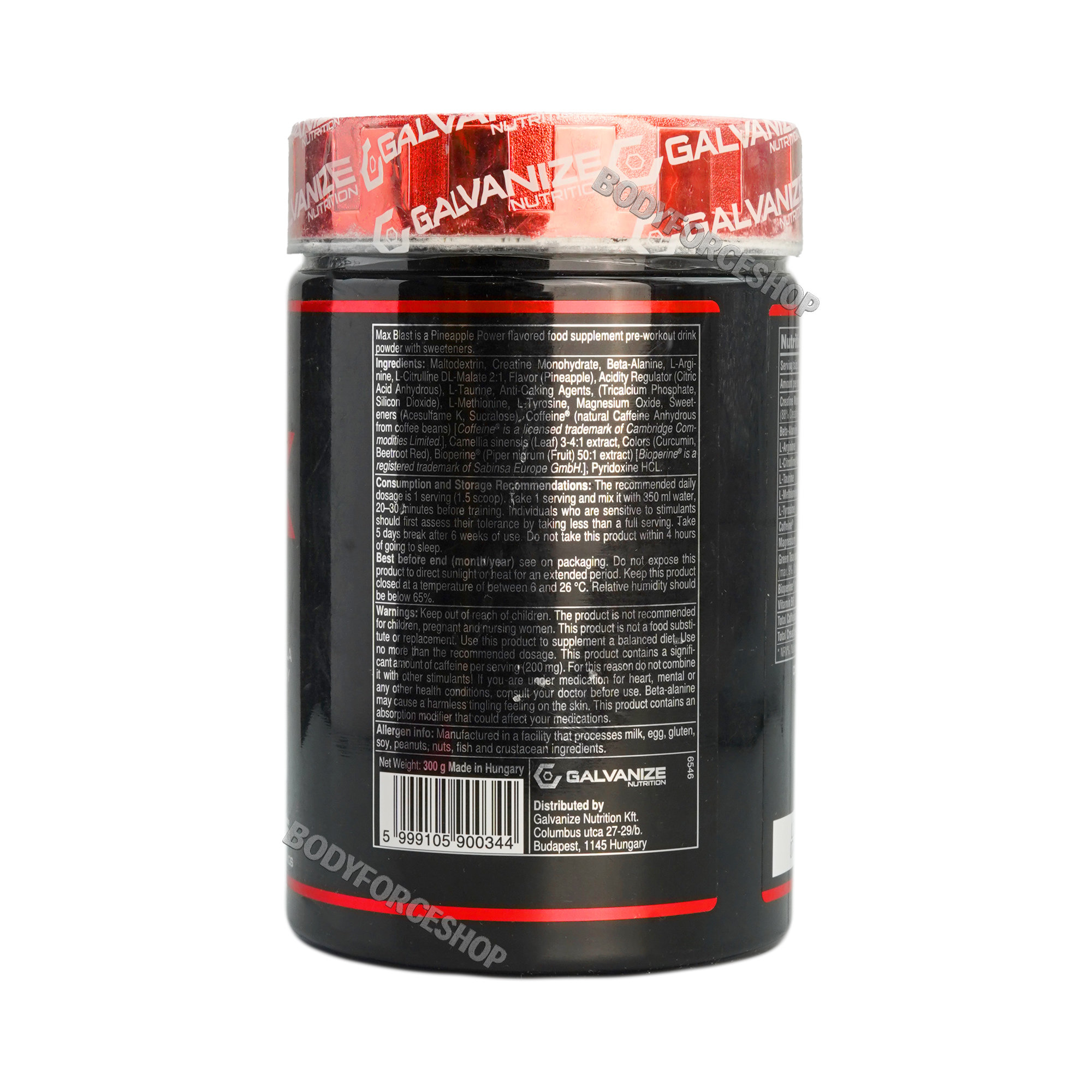 پمپ مکس بلیست گالوانیزه از کمپانی Galvanize Nutrition یک مکمل قبل از تمرین قدرتمند است که برای افزایش انرژی، تمرکز ذهنی و پمپاژ عضلانی طراحی شده است. پمپ مکس بلیست گالوانیزه با ترکیباتی مثل کراتین مونوهیدرات، بتا آلانین، سیترولین مالات، آرژنین، تائورین و کافئین طبیعی فرموله شده تا عملکرد ورزشی را به سطح بالاتری برساند، و در بستهبندی ۳۰۰ گرمی عرضه میشود.
