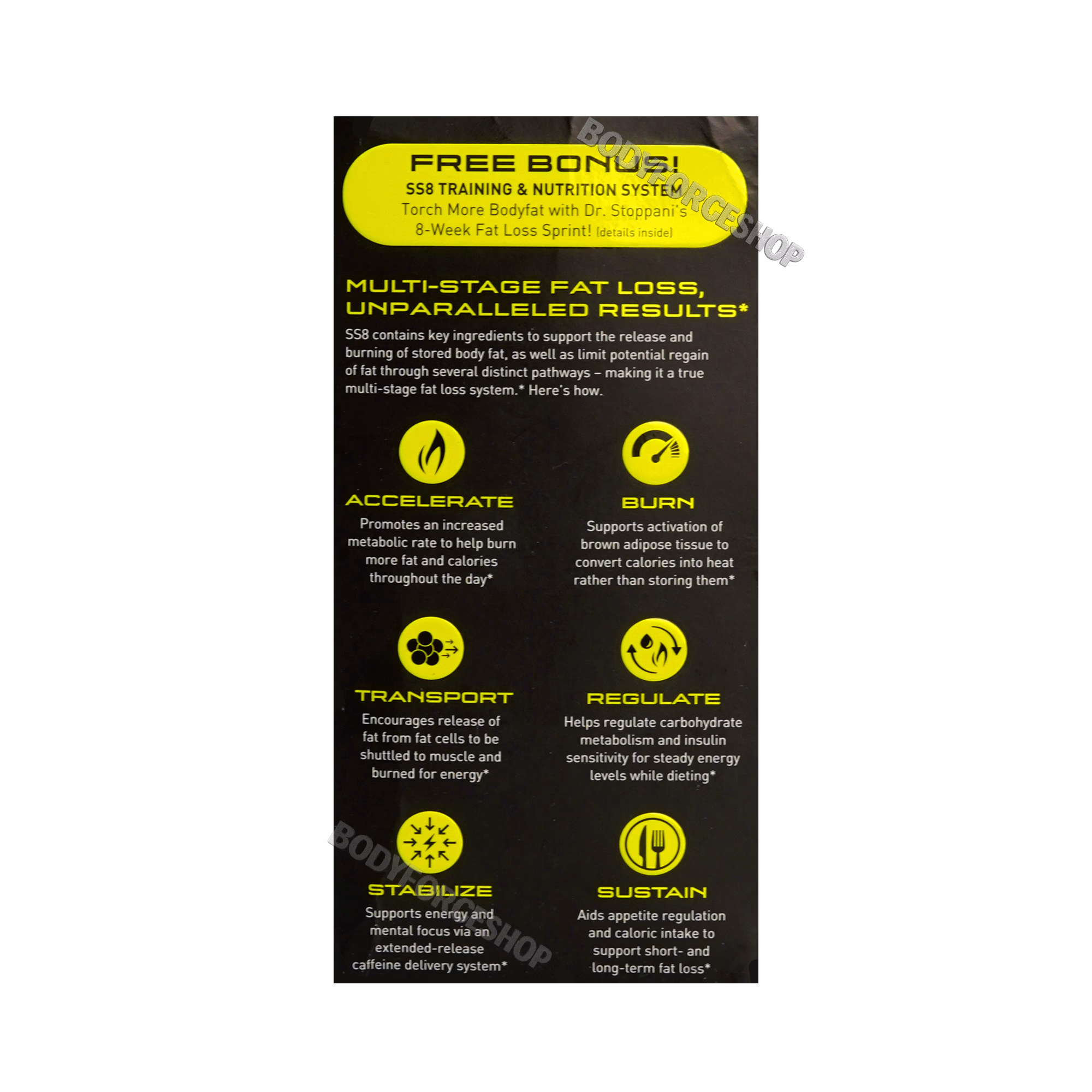 فرمول SS8 با استفاده از کافئین رهش طولانی (zumXR®) و کافئین اصلاح شده، انرژی پایدار و تمرکز ذهنی را در طول روز حفظ میکند. ترکیب Grains of Paradise باعث فعالسازی بافت چربی قهوهای و افزایش کالریسوزی میشود، در حالی که Chromax® Chromium Picolinate به تنظیم انسولین و کاهش اشتهای کربوهیدراتی کمک میکند. همچنین AdrenaJYM® با ترکیب Yohimbine و Rauwolscine باعث آزادسازی چربی از سلولها و تحریک هورمونهای چربیسوز میشود. این مکمل فاقد گلوتن، شکر، سویا و مواد نگهدارنده مضر بوده و برای مصرف روزانه در دورههای رژیم، کات یا آمادگی مسابقهای بسیار مناسب است.اگر هدف شما کاهش توده چربی و چربی سوزی در کنار افزایش سطح انمرژی و حفظ توده عضلانی باشد این محصول بهترین گزینه برای شما می باشد .