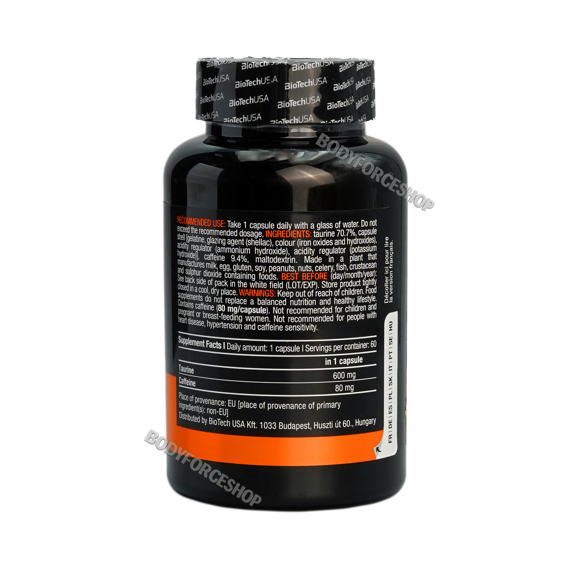 مکمل Caffeine + Taurine از کمپانی BioTechUSA ترکیبی از ۸۰ میلیگرم کافئین و ۶۰۰ میلیگرم تائورین در هر کپسول است که برای افزایش انرژی، تمرکز و چربیسوزی طراحی شده است. این محصول جایگزینی مؤثر و سالم برای نوشیدنیهای انرژی زا پرقند و کمدوز است. تائورین به بهبود عملکرد عضلات و افزایش حجم سلولی کمک میکند، در حالی که کافئین متابولیسم را بالا میبرد. این مکمل بدون گلوتن، لاکتوز و GMO تولید شده و برای مصرف روزانه قبل از تمرین بسیار مناسب است، مناسب برای افراد با اهداف افزایش انرزی فوری و افزایش سطح تمرکز و کیفیت بالاتر عضلات می باشد .
